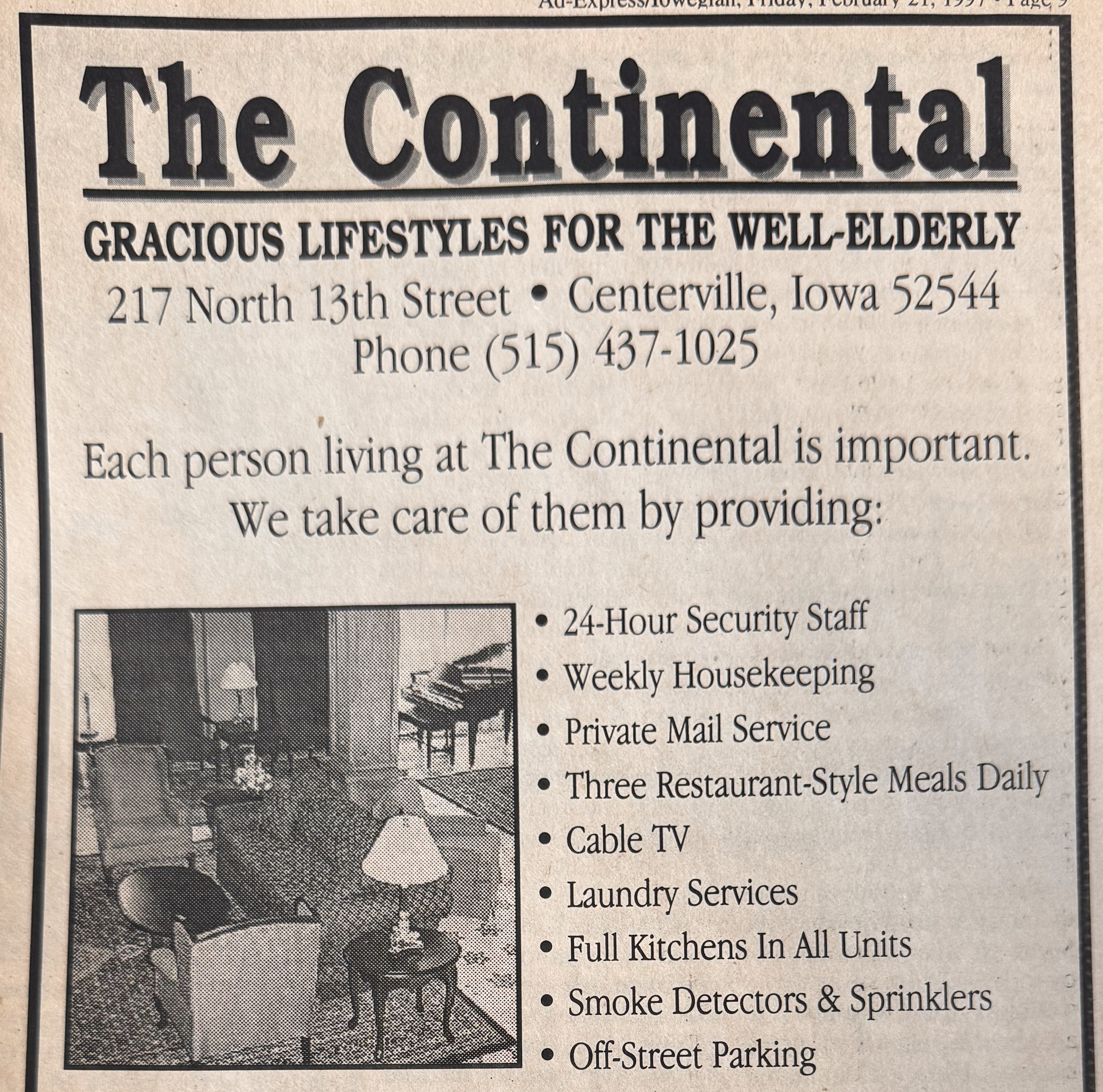 By the 1970s, the Continental had become something of a living time capsule. A 1977 Centerville Iowegian and Citizen article described the hotel as having “seen the coming of the automobile and the end of the horse-drawn wagon,” surviving two major wars and 27 presidential elections. Though age showed in peeling paint and worn carpets, the paper noted that the hotel still retained “an air of distinction”