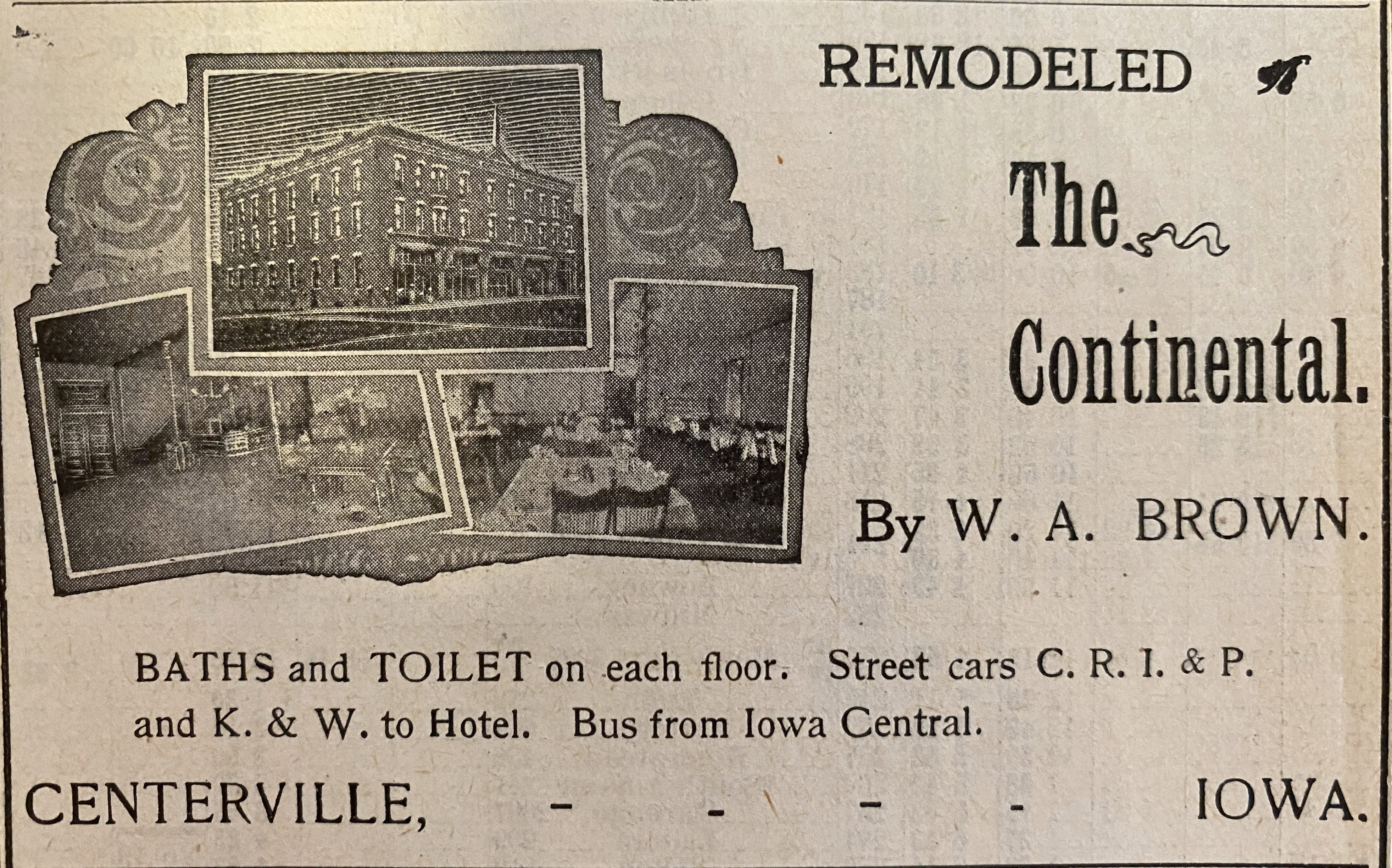 The hotel stood prominently on the Centerville square at a time when dirt roads, wooden storefronts, and horse-drawn wagons defined daily life. According to a later Centerville Iowegian and Citizen retrospective, the hotel “was a showplace for its time” and quickly became woven into the civic and social fabric of the town.